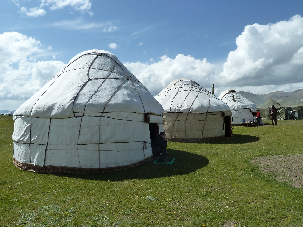Després de vorejar el llac Issik-Köl vam arribar a Kochkor, on hi vam passar un dia i vam organitzar una excursió d’una nit fins al llac Song-Köl (3.016m), on vam poder passejar a cavall (evidentment res a veure amb els cavalls de Kuadra Belene, http://www.kuadrabelene.com), dormir en una iurta i compartir un dia amb els shepards (seminònades que es desplacen amb els seus ramats a les pastures d’estiu). Durant aquesta època famílies senceres amb els ramats i les seves iurtes pugen fins als jailoos per passar-hi bona part de l’estiu. És impressionant la quantitat d’animals que hi ha pasturant en els inmensos prats de les vores del llac, que estan plens de flors de neu, que costa no trepitjar al caminar. Les úniques construccions que es troben a la vora del llac són les iurtes, els habitatges preferits pels nòmades. Són mòbils, amb estructura de fusta i coberta de feltre. És més semblant a una casa que a una tenda, tant en la forma com en l’estructura, amb parets gruixudes. Les tradicionals es componen d’una estructura circular de fusta coberta de feltre fet de llana de les ovelles. L’estructura, que s’aguanta per si sola i no té ni un clau, és feta de fusta enreixada, un marc per a la porta, pals per al sostre i un coronament especial, que té forma creuada tal i com es pot veure a la bandera del país. L’interior està decorat amb llampants robes de colors, i el terra amb els típics shyrdaks (catifes de colors). Com més elaborada és la decoració, més elevada és la posició social del seu propietari. La iurta està dissenyada per ser desmuntada i carregada sobre un camell, un iac o un cavall, per ser transportada d’un lloc a un altre, on es tornarà a muntar