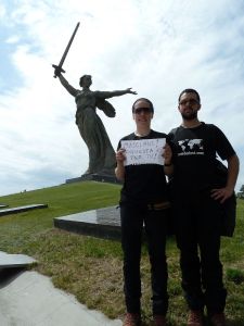un emocionant monument de 85 m situada al turó Mamáyev Kurgán, la construcció de la qual va començar l’any 1959 i va acabar el 1967 i visible gairebé des de tota la ciutat. La visitàvem l’endemà juntament amb el Museu de la defensa de Stalingrad, tot i que per entendre els textos d’aquest últim, hagués estat bé saber rus. Ja es podrien currar, com a mínim, una traducció a l’anglès. Vam tenir la fortuna de coincidir a la visita amb uns quants reclutes russos, que més que russos semblaven la legió d’en Sancho Panza (amb tots els repectes Sancho), ai si us veiés el del bigoti! Permeteu-nos dedicar aquesta visita al Toni. (Toni hi has d’anar!)
